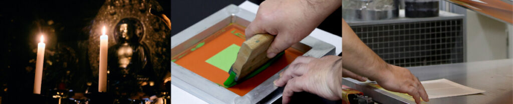 御本尊のご供養に用いたろうそくを、タカラサプライコミュニケーションズ株式会社の独自印刷技法により、御朱印の蓮と波の紋様に溶かして納めた「拝蝋紙(はいろうし)」にて授与いたします。阿弥陀如来の功徳をいただける御朱印です。