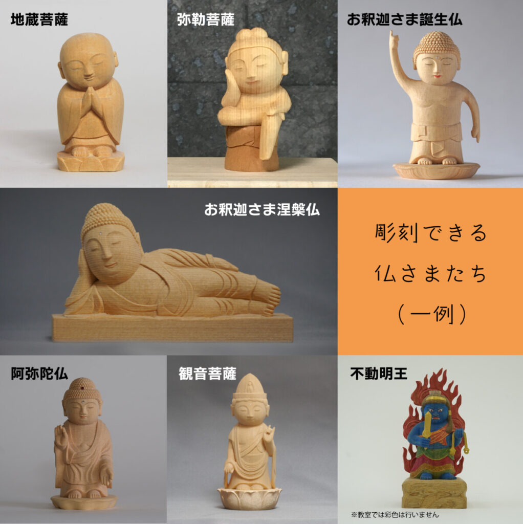 彫刻教室を繰り返し体験いただくことも可能です。偶数月2回目火曜日の教室では、お釈迦さま(誕生仏)など、初回とは異なる仏さまを彫っていただくこともできます。ただし、完成までに2回の参加が必要になる仏さまもあります。