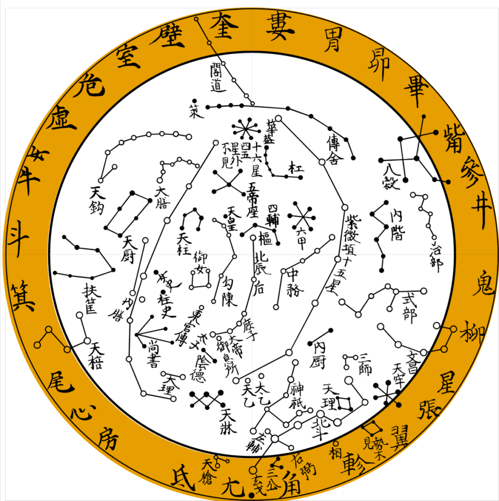 星図の周囲に並ぶ漢字は、月の通り道を28(あるいは27)の「宿」に分類して示すものです。私たちの生まれた「宿」と「曜日」を用いて行う占術が、宿曜占星術です。