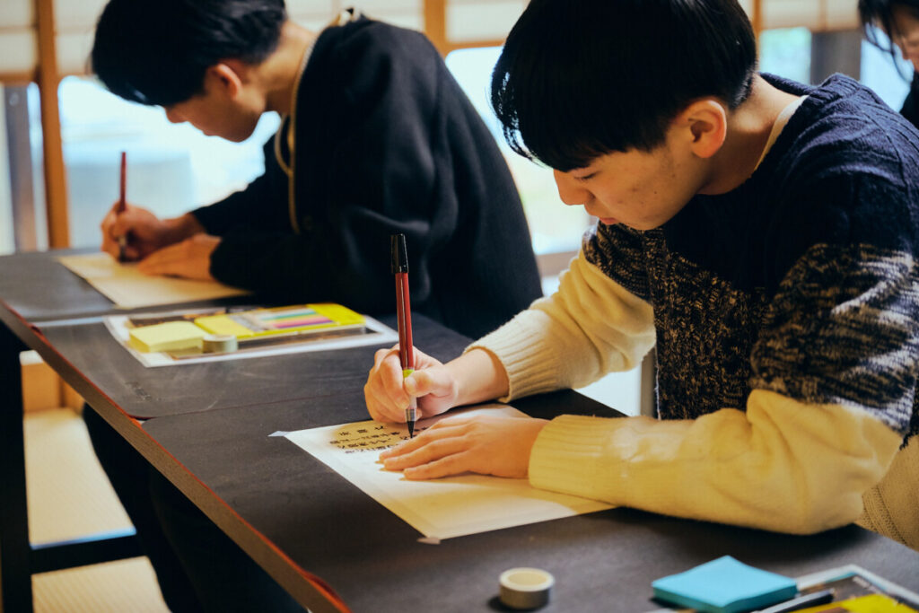 最初に本堂で勤行をしたのちに、和室で写経に励んでいただきます。書き上げられた写経用紙は、ご本尊の台座の下にご奉納いたします。写経に必要な道具はすべてこちらでご用意いたします。